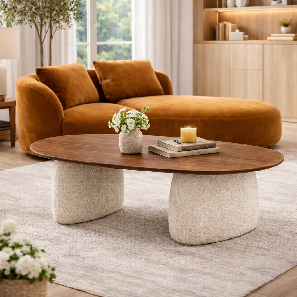 Tavolo ovale dal design contemporaneo con piano in legno naturale e doppia base scultorea in pietra chiara. Le forme morbide e le proporzioni equilibrate creano una presenza elegante e solida, ideale per sale da pranzo moderne, spazi living raffinati e ambienti di design. Materiali di qualita e stile senza tempo garantiscono durata e impatto estetico.